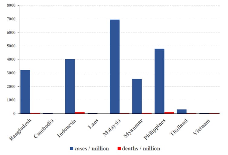 The data in the figure above indirectly support the hypothesis that the SARS-CoV-2 group actually originated in mainland Southeast Asia. Indeed, human populations in Cambodia, Laos, Thailand and Vietnam appear to be much less affected by the Covid-19 pandemic than other countries in the region, such as Bangladesh, Myanmar, Malaysia, the Philippines and Indonesia. This suggests that the populations of these four countries may be benefiting from a level of herd immunity to Sarbecoviruses.