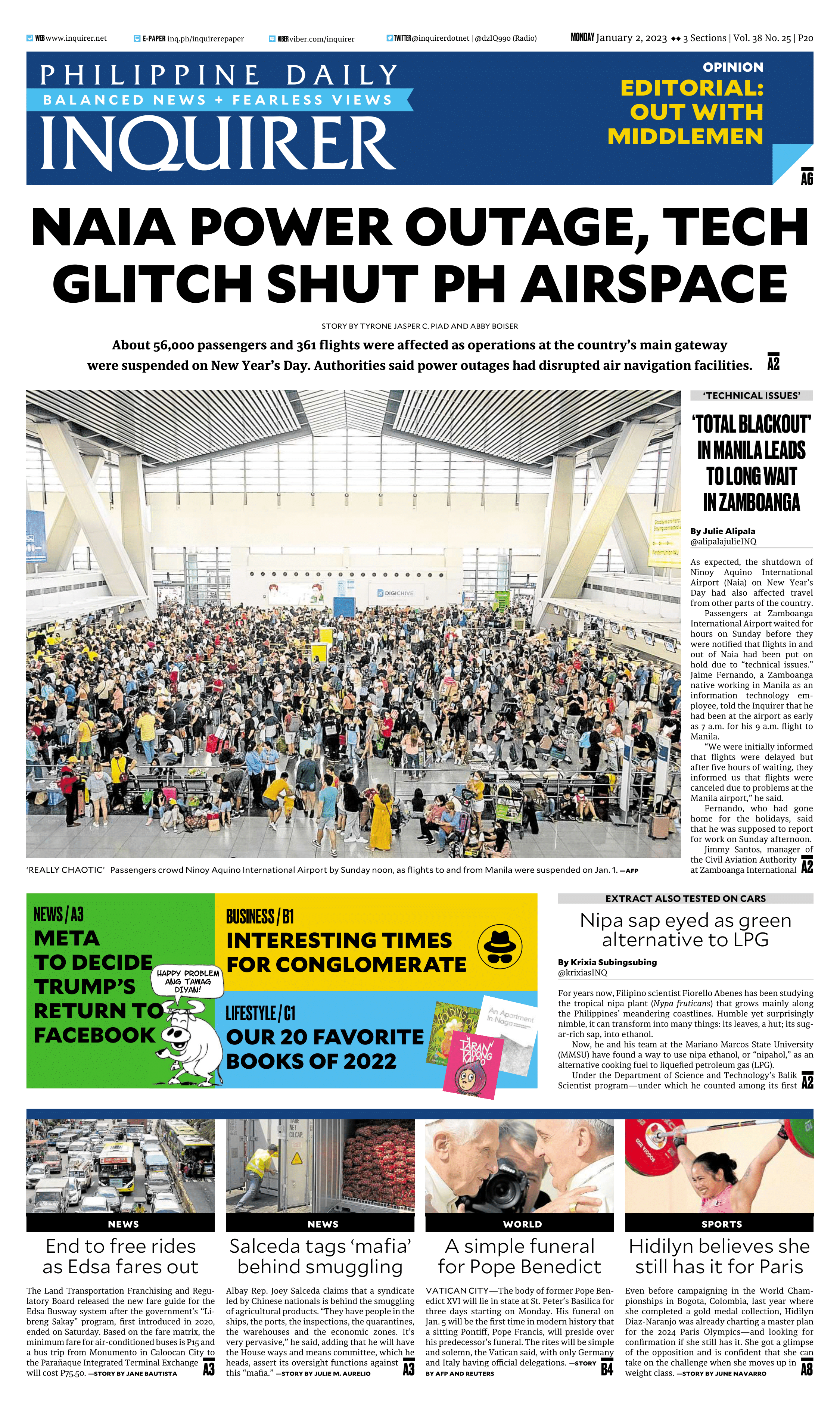 Around 56,000 passengers were affected when 361 flights to and from Manila were either canceled, diverted or delayed on New Year’s Day after power outages downed air navigation facilities of the Civil Aviation Authority of the Philippines (CAAP).In a press briefing on Sunday night, Transportation Secretary Jaime Bautista told reporters that this resulted in the loss of communication, radio, radar and internet at Ninoy Aquino International Airport (Naia). He said the equipment providing uninterrupted power supply in two Naia terminals suddenly went offline and failed to connect to the backup commercial power supply of Manila Electric Co. (Meralco).