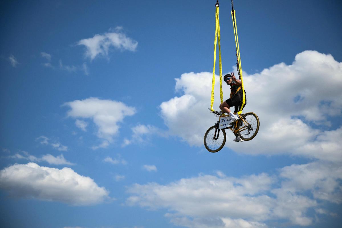A spectator sits atop a bicycle suspended above the race route during the 16th stage of the 111th edition of the Tour de France cycling race, between Gruissan and Nimes, southern France, on July 16, 2024. PHOTO: AFP