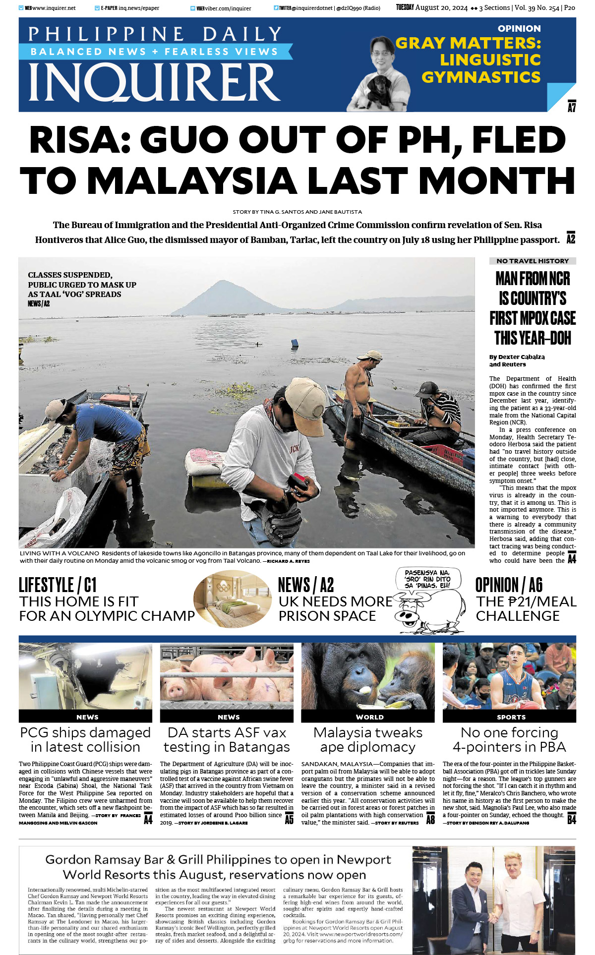 PAPER EDITIONS | 8.20.24 – Tuesday | Bureau of Immigration-BI: Alice Guo flew to Malaysia, Singapore