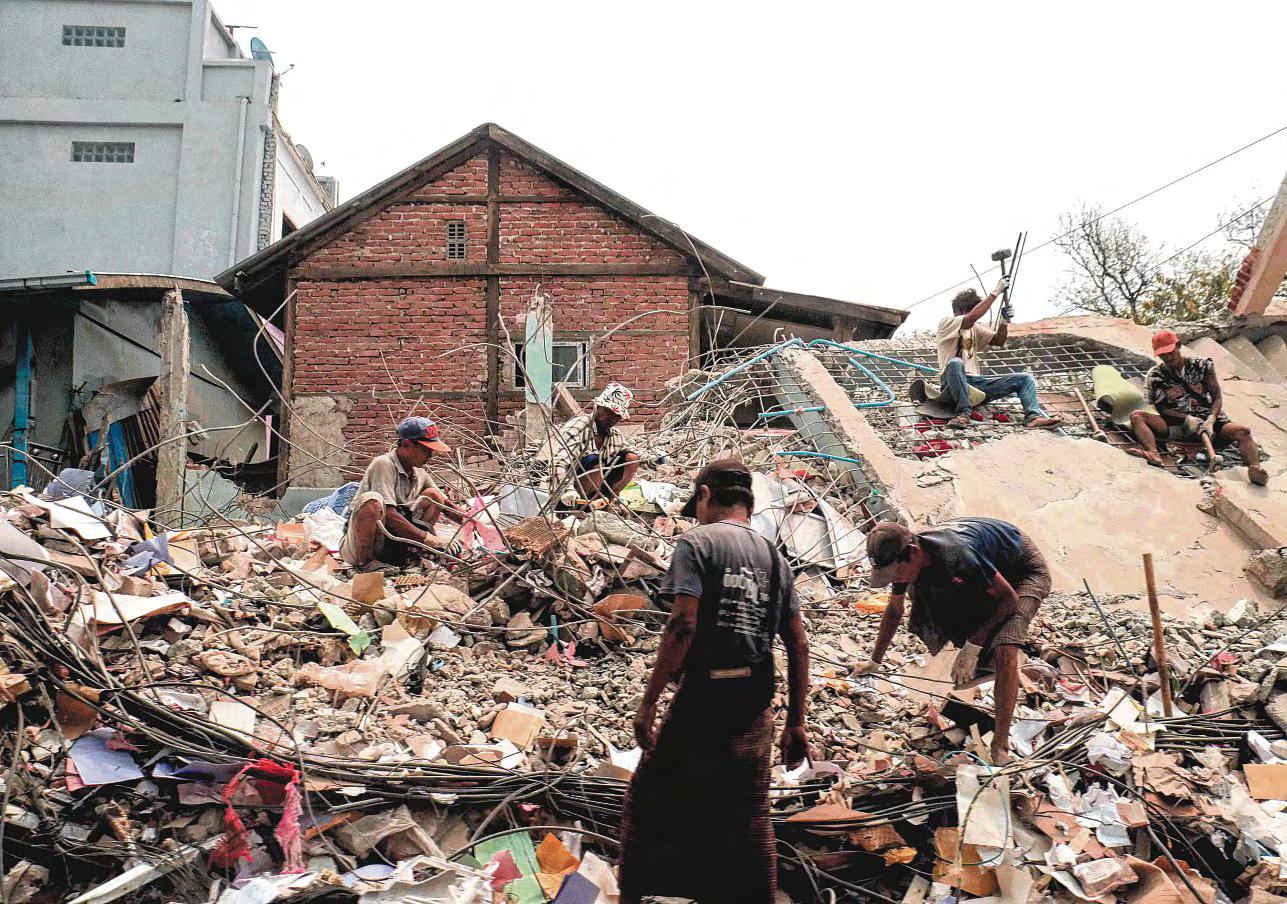 People sort through the rubble of a collapsed building in Mandalay on April 5, following the March 28 earthquake.PHOTO: AFP