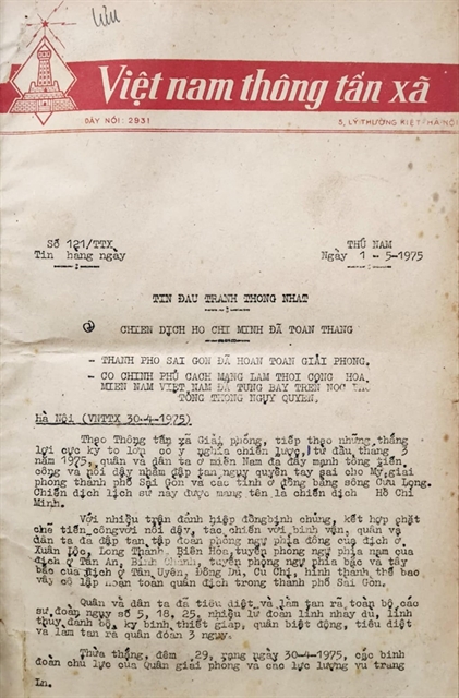 The historic bulletin declared: “At exactly 11.30am on April 30, 1975, the flags of the Provisional Revolutionary Government of the Republic of South Vietnam flew atop the puppet regime’s Presidential Palace and across the city. Sài Gòn, renamed HCM City, has been completely liberated.” — VNS
