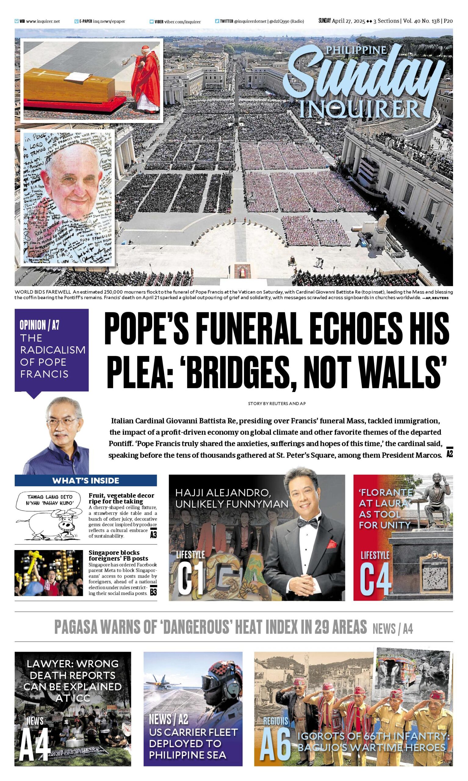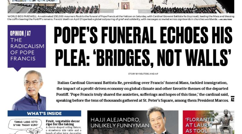 ASEANEWS General Headlines Latest PAPER EDITIONS | 4.27.25 Sunday | POPE’S FUNERAL ECHOES HIS PLEA: ‘BRIDGES, NOT WALLS’ April 27, 2025 Contributor 0 Comment PAPER EDITIONS | 4.27.25 Sunday | POPE'S FUNERAL ECHOES HIS PLEA: BRIDGES NOT WALLS ASEAN HARD COPIES: . Other Copies: It's only fair to share...