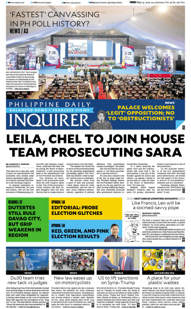 PAPER EDITIONS | 5.15.25 Thursday | De Lima, Diokno join prosecutors in VP Sara impeach trial