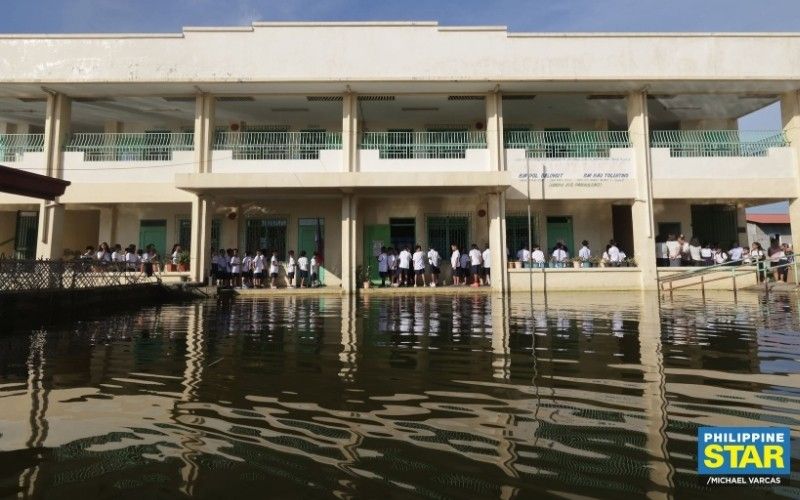 Students of San Gabriel Elementary School in Macabebe, Pampanga make the most of the remaining space for school activities on the first day of classes on Monday, June 16, 2025. The school has long been plagued by decades of flooding due to rising water levels, worsened by climate change, making it increasingly difficult for students and teachers to conduct classes—especially during typhoon season./ The STAR / Michael Varcas
