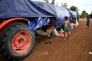 An evacuee who fled their home near the border between Cambodia and Thailand rests in a hammock under a truck on the grounds of a pagoda in Oddar Meanchey province on July 28, 2025. PHOTO: AFP