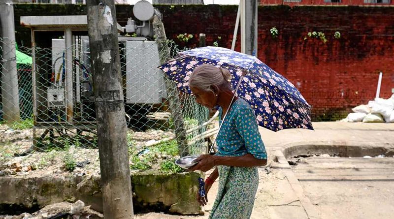 An elderly woman walks under an umbrella to shelter from the sun amid hot weather in Yangon on August 13, 2025. PHOTO: AFP