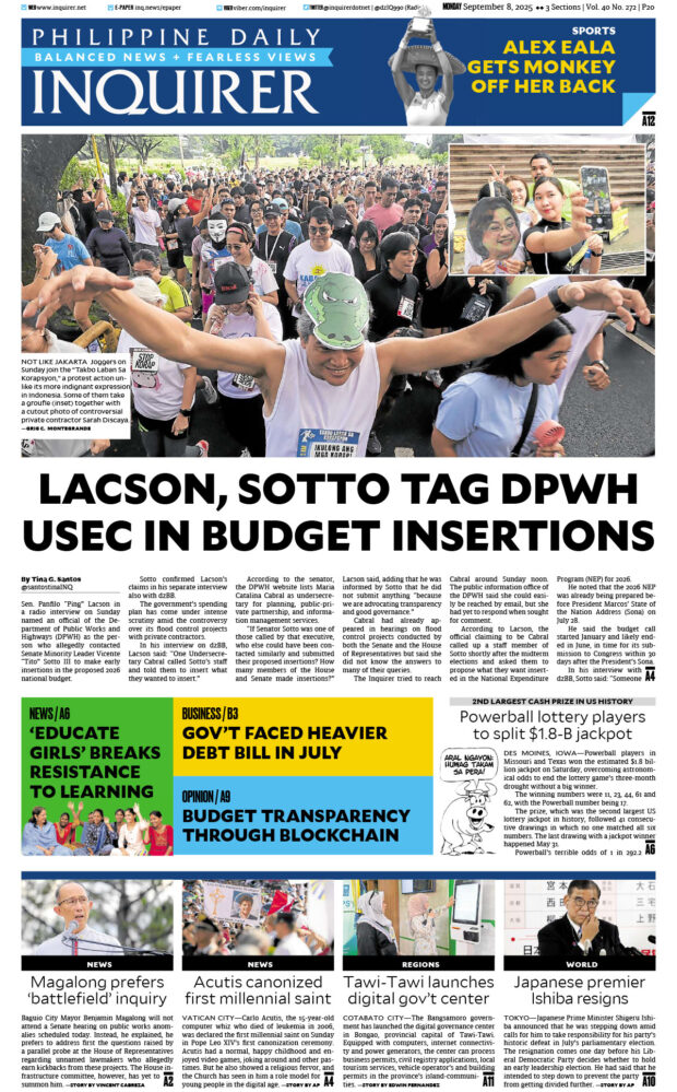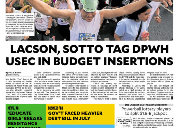 ASEANEWS General Headlines Latest PAPER EDITIONS | 9.8.25 – Monday | Lacson, Sotto tag DPWH usec in budget insertions September 8, 2025September 8, 2025 Contributor 1 Comment PAPER EDITIONS | 9.8.25 – Monday | Lacson, Sotto tag DPWH usec in budget insertions ASEAN HARD COPIES .. Other Copies It's only fair to share...