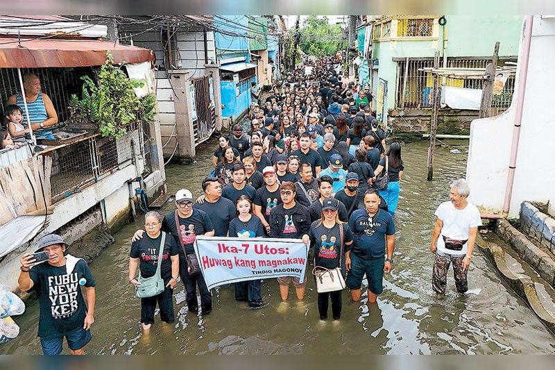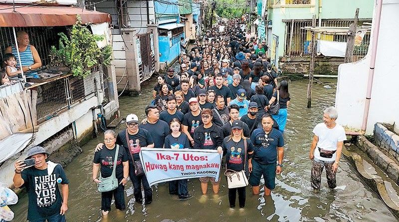 In Hagonoy in Bulacan, residents and members of multi-sectoral groups waded in flooded streets after a mass at the National Shrine of St. Anne to dramatize their protest against anomalies in flood control projects in the municipality and in the entire province.