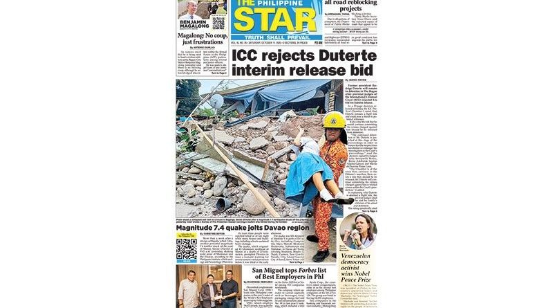 ASEANEWS General Headlines Latest PAPER EDITIONS | 10.11.25 –Saturday | ICC rejects Duterte interim release bid October 11, 2025October 11, 2025 Contributor 0 Comment PAPER EDITIONS | 10.11.25 –Saturday | ICC rejects Duterte interim release bid ASEAN HARD COPIES ... Other Newsprints It's only fair to share...