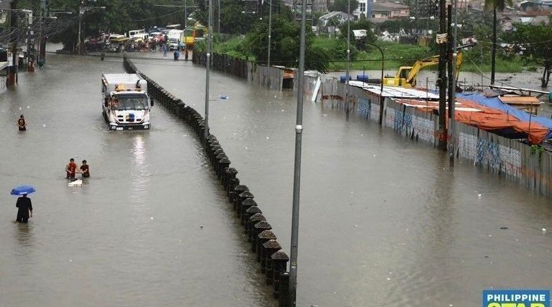 Stranded commuters wade through waist-deep floodwaters as motorists move their vehicles to elevated ground near the Zapote Junction Flyover in Las Piñas on July 22, 2025. /Edd Gumban / The Philippine STAR