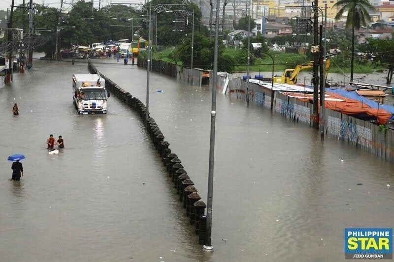 Stranded commuters wade through waist-deep floodwaters as motorists move their vehicles to elevated ground near the Zapote Junction Flyover in Las Piñas on July 22, 2025. /Edd Gumban / The Philippine STAR