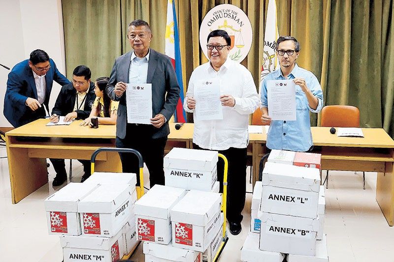 Independent Commission for Infrastructure chairman Andres Reyes Jr. and Department of Public Works and Highways Secretary Vince Dizon submit to Ombudsman Jesus Crispin Remulla documents recommending plunder and graft charges against seven lawmakers and resigned congressman Zaldy Co over the flood control corruption scandal./ MIGUEL DE GUZMA