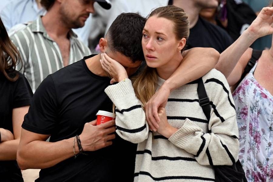 Police officers assist a visitor at the scene of a shooting at Bondi Beach in Sydney on December 15, 2025. – AFP