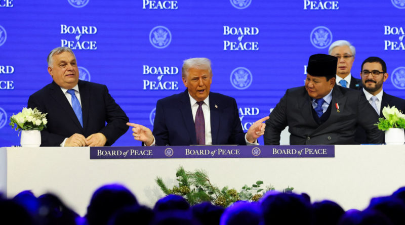 United States President Donald Trump (center) gestures toward President Prabowo Subianto (right) and Hungary’s Prime Minister Viktor Orban, as they take part in a charter announcement for his Board of Peace initiative aimed at resolving global conflicts, alongside the 56th annual World Economic Forum (WEF), in Davos, Switzerland, Jan. 22, 2026. (Reuters/Denis Balibouse)