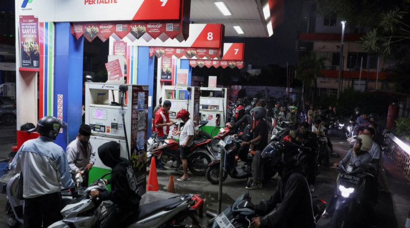 Motorists queue on March 31, 2026, to refuel at a gas station owned by state-owned oil and gas company Pertamina in Depok, West Java, as the government announced limits on subsidized fuel sales to counter the impact of the United States-Israeli war on Iran. (Reuters/Ajeng Dinar Ulfiana)