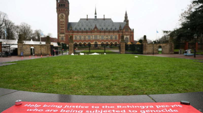 A banner in support of the Rohingya people is seen on Jan. 17, 2026, outside the International Court of Justice