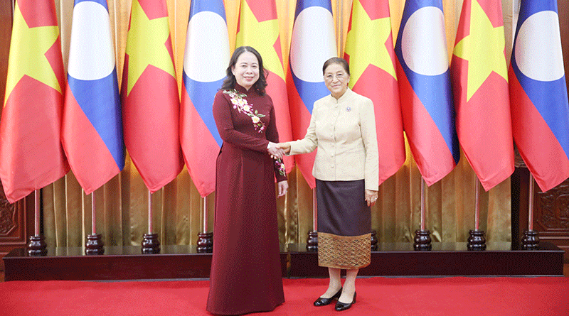 Vice President Ms Pany Yathotou (right) welcomes her Vietnamese counterpart Ms Vo Thi Anh Xuan. … The Vice